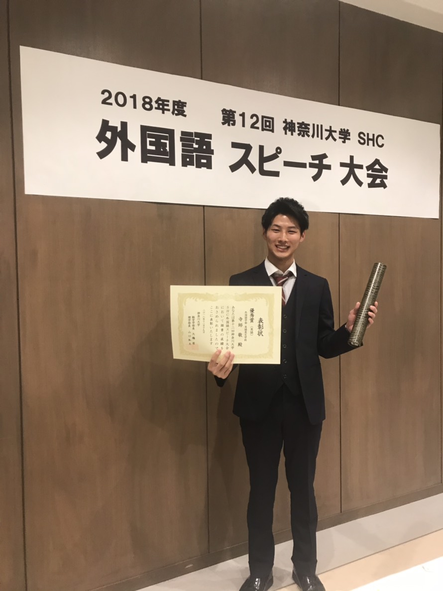 「実は、先日学内の外国語スピーチコンテストで表彰されました!